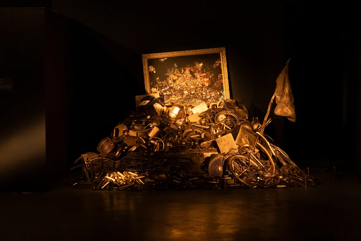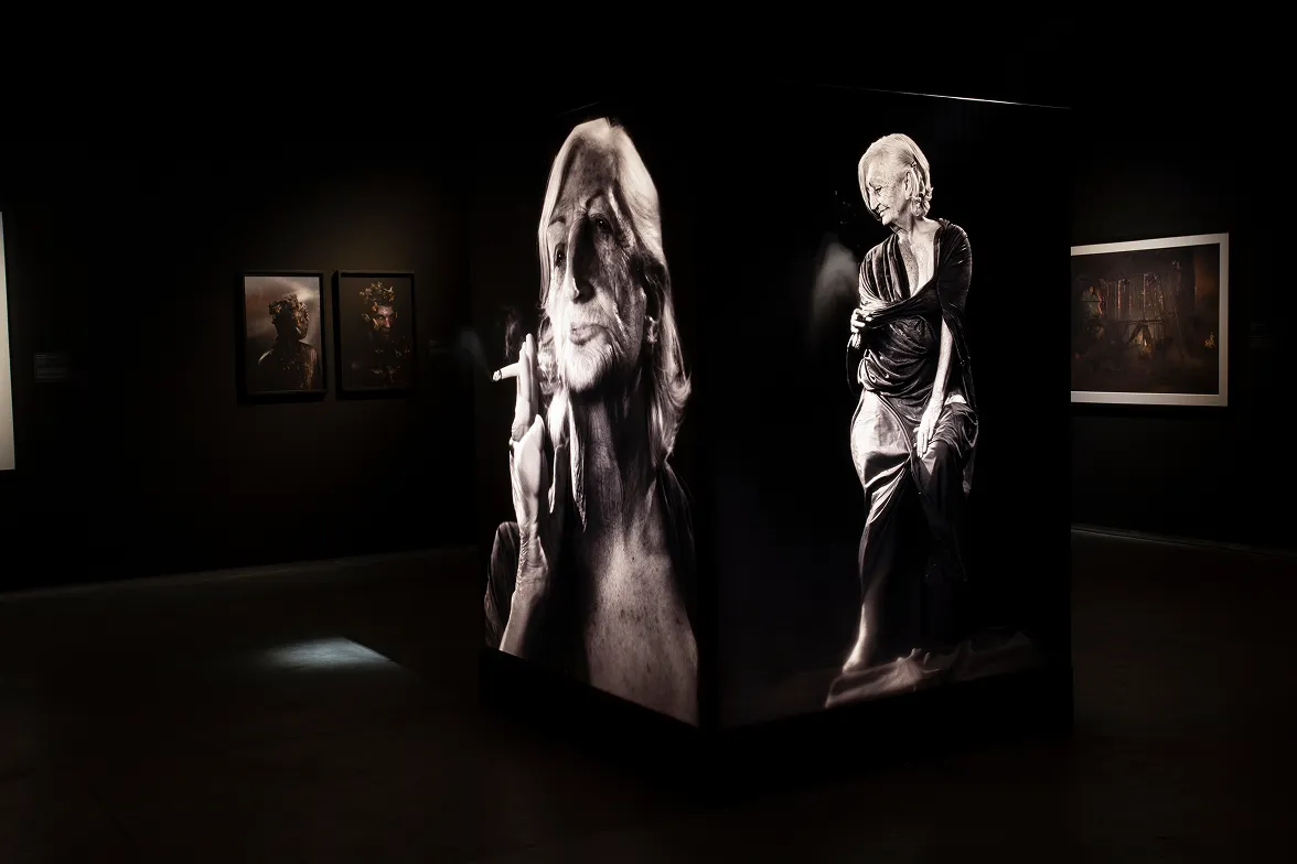 La exposición incorporó una dimensión espacial inmersiva: la sala del Centre d’Art Lo Pati acogió parte de las escenografías creadas específicamente para las fotografías. Lejos de funcionar como simple acompañamiento, estos elementos instalativos ampliaban la experiencia visual, permitiendo al visitante recorrer físicamente los entornos que estructuran la lógica interna de las imágenes. El recorrido se completaba con una pieza audiovisual del documentalista Quim Melchor, compuesta por fragmentos del proceso, registros del taller y momentos de creación que revelaban la intensidad emocional y material del proyecto.