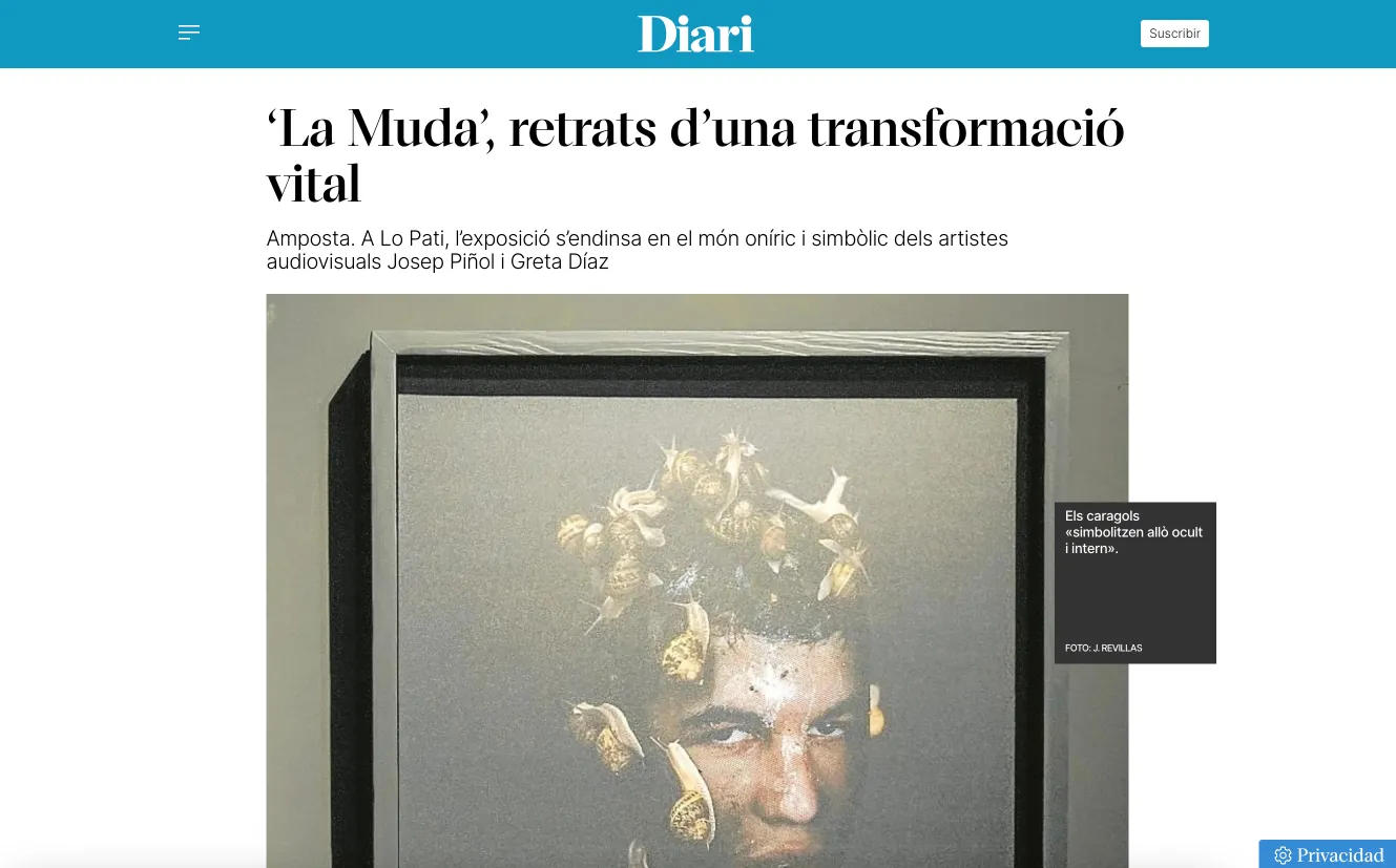 Presentada en 2021 en el Centre d’Art Lo Pati de Amposta, La Muda es fruto de un proceso creativo de más de un año y medio desarrollado por los artistas Josep Piñol y Greta Díaz. El proyecto tomó forma en una antigua nave agrícola a las afueras de Tivenys, transformada en estudio, donde ambos construyeron un universo visual introspectivo, atravesado por la tensión entre encierro y deseo, transformación y resistencia.