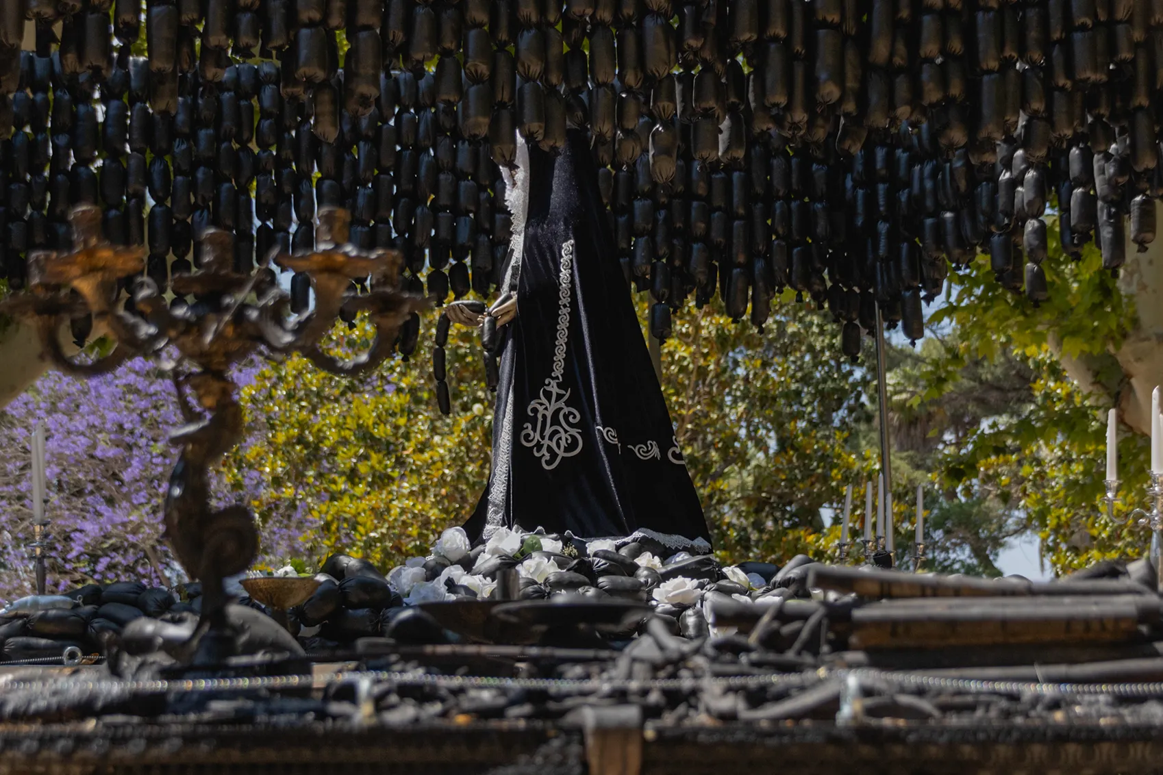 Con 4.600 morcillas de tela y 60 huesos de cerdo reutilizados, la instalación acentuaba la dimensión material y ritual de lo sagrado. No como denuncia, sino como homenaje: una puesta en común que asume la estética del exceso como parte esencial de las formas populares de lo trascendente.