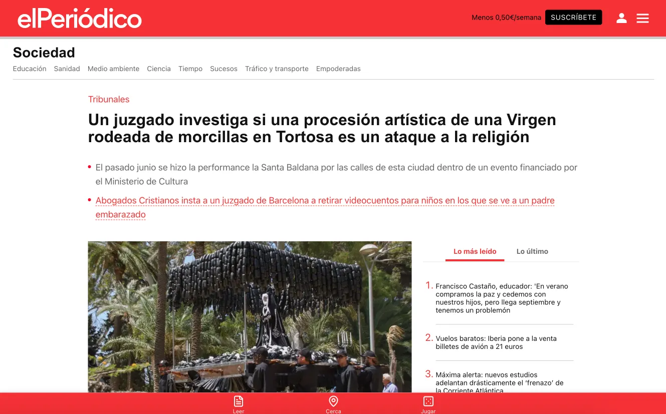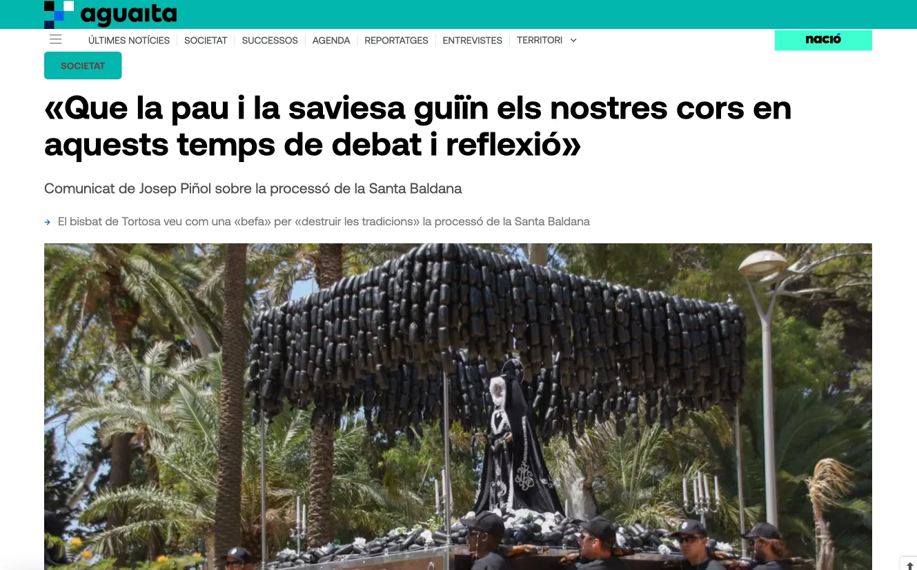 El Obispado de Tortosa y las cofradías de la ciudad emitieron un comunicado apelando al respeto hacia “la fe y las tradiciones que han sido objeto de burla y menosprecio”. El partido VOX calificó la acción como “un insulto a los cristianos con dinero público”, mientras el alcalde organizaba una rueda de prensa para desvincularse institucionalmente del proyecto. En paralelo, redes sociales y medios digitales amplificaron el eco de la pieza. El Periódico, La Vanguardia, El Mundo, ABC, La Razón, TV1, TV3, RAC1, Catalunya Ràdio, Cuatro, Canal Sur o La Sexta dedicaron espacios al debate, desde programas culturales hasta tertulias políticas.
