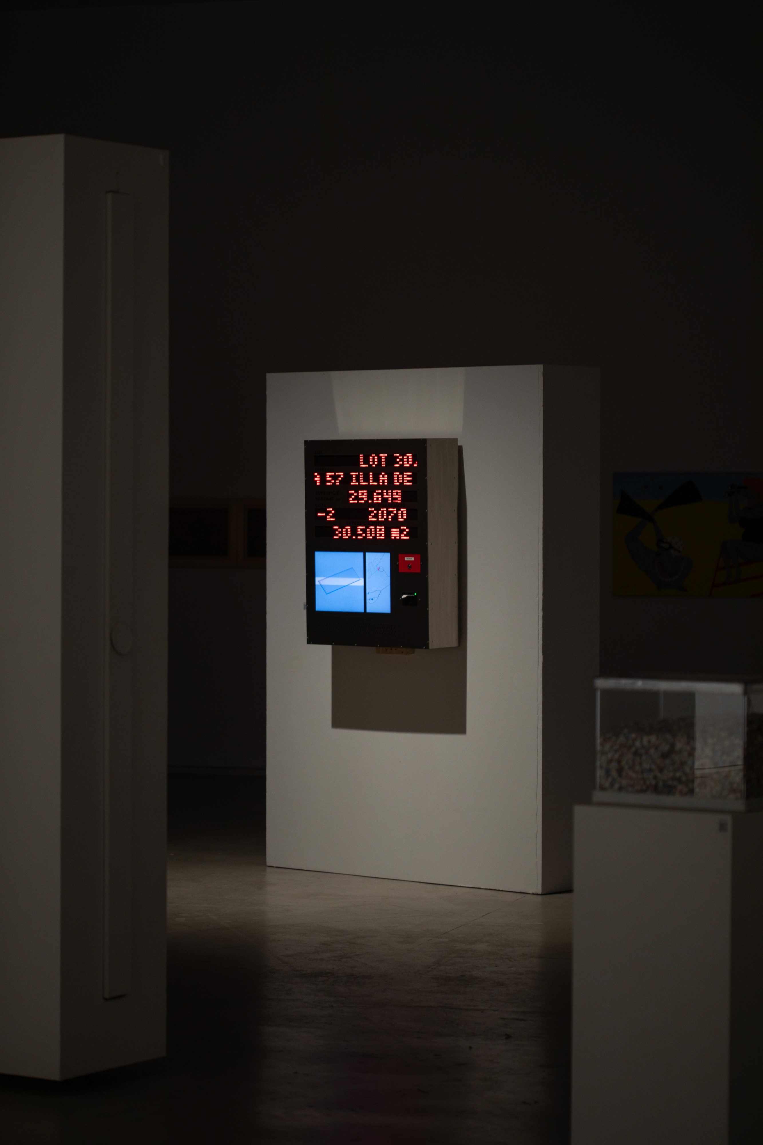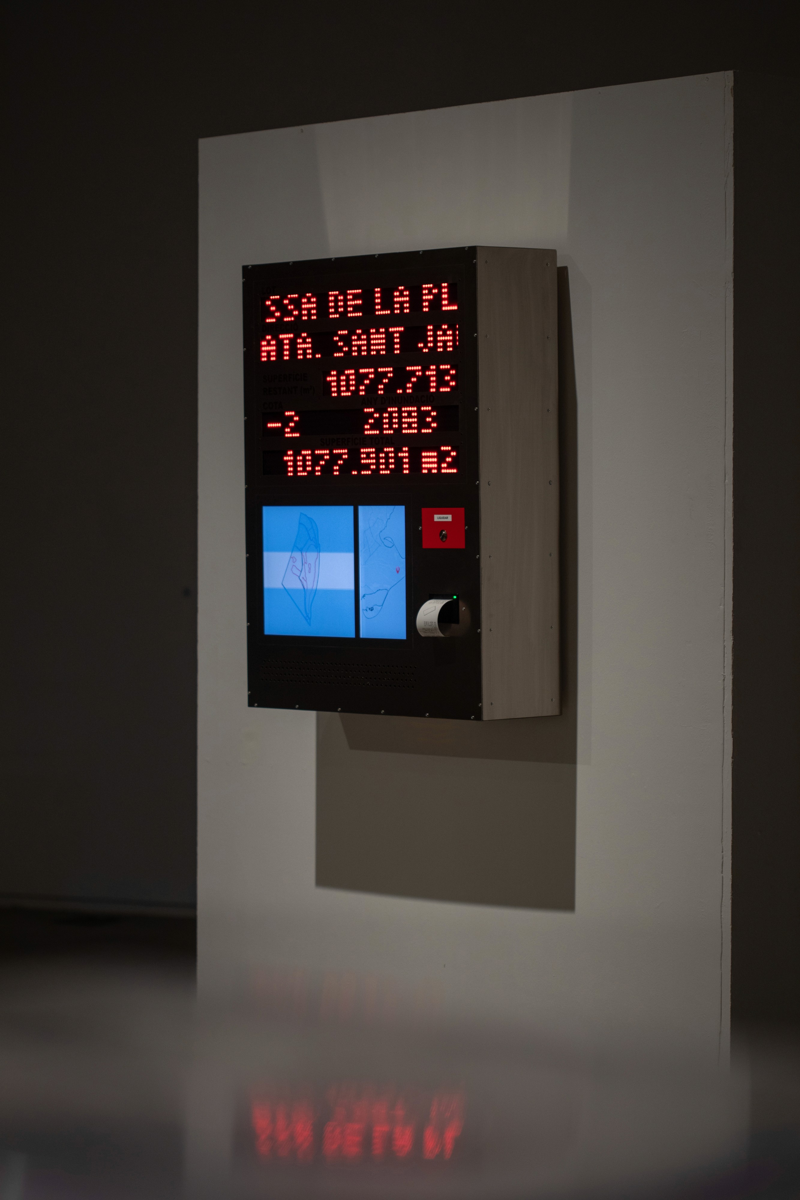 Each lot is identified on the counter by a series of fixed data: the name of the plot, for example, “Lot 09: inland rice field, building”; cadastral address; total surface area in square metres; elevation; and estimated year of flooding. Alongside this information appears a dynamic figure: the plot’s available surface area, which rapidly decreases in real time. This decrease functions as a mechanism of urgency. The viewer can press the red button to stop the count and acquire the portion of land still remaining at that precise moment; if they fail to intervene in time, the surface area reaches zero and the lot is lost, automatically giving way to the next one.