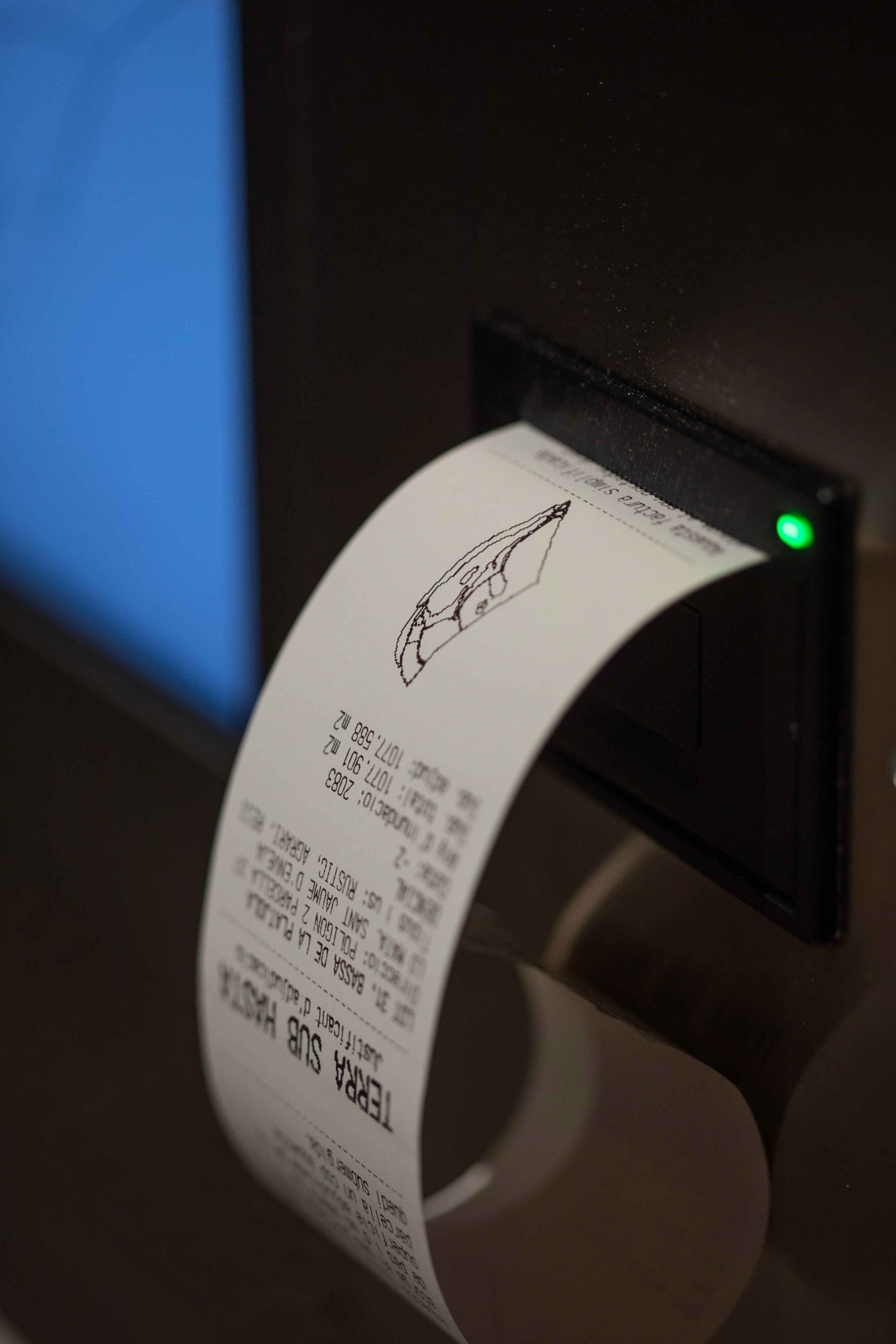 If the visitor presses the button, the thermal printer issues an ordinary ticket, similar to a commercial receipt, recording the completed transaction. It includes the lot data, the surface area actually acquired at the moment of pressing, and the outline of the plot according to its cadastral record. This ticket functions at once as receipt, certificate, and material trace of an absurd transaction: the acquisition of a future right of use over land already condemned to be submerged.